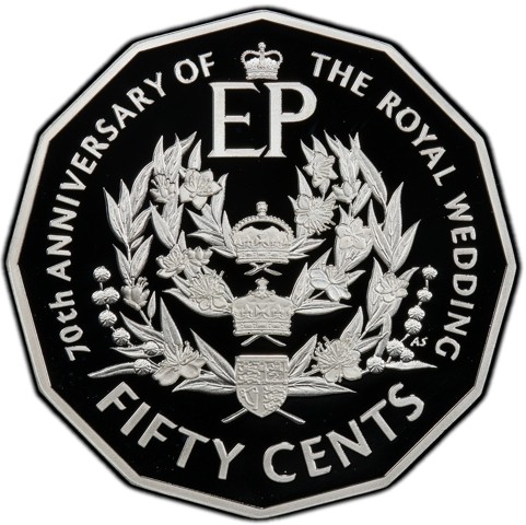 The reverse of the coin shows the royal couple are represented by their monogram ‘EP’ while wreaths of myrtle represent their children, grandchildren and great grandchildren. Each wreath is pinned by the heraldic symbol of the Princes in the direct line of succession: The Prince of Wales Charles, The Duke of Cambridge Prince William and Prince George of Cambridge. The remaining royal family are represented by myrtle blossoms, an ancient symbol of marriage and love. Sprays of wattle, each with seven blossoms, represent the royal couple’s seven decades of marriage surrounded by inscription "70th ANNIVERSARY OF THE ROYAL WEDDING" anD face value in letters below .