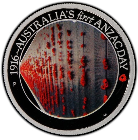 The coin’s reverse depicts an image of the Roll of Honor at the Australian War Memorial in Canberra. The inscription identify theme "1916 - AUSTRALIA'S first ANZAC DAY" above, a red poppy at the right side, and the Perth Mint's 'P' mintmark at the opposite. The designer's initials "AH" in tiny letters right below.