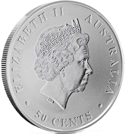 Fourth crowned portrait of HM Queen Elizabeth II facing right, wearing the Girls of Great Britain and Ireland tiara. framed by inscriptions ELIZABETH II, AUSTRALIA, 50 CENTS. Denomination is placed below.