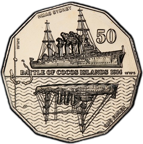 The reverse of the coin depicted light cruiser "HMAS Sydney" above with its name and a German light cruiser SMS Emden involved in the Battle of Cocos Islands, mirrored on the open sea where SMS Emden sunk below with its name, the inscription identify theme "BATTLE OF COCOS ISLANDS 1914" dividing them and face value above right. Latitude and longitude are marked where the battled occurred. Map of The Cocos Islands to the left.