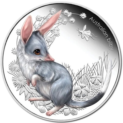 The reverse portrays beautifully illustrated and an adorable little bilby with its eyes bright and alert. The baby bilby is set against a background of native flowers and foliage. The design includes a grasshopper friend. The Perth Mint's mark, "P," is included between grasses and the designer's initials "EM" in tiny letters at the bottom.