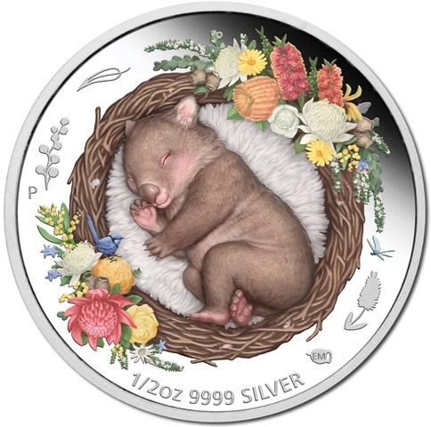 The coin depicts a cute baby wombat asleep in a fleece-lined twig basket – a prop that has created a popular trend in newborn photography among parents all around the world. As well as the rim is decorated colorful Australian native flowers and wildlife, the design also incorporates The Perth Mint’s ‘P’ mintmark is on the left. The designer's initials (EM) are incuse in a gumnut on the right and silver purity and weight is around below.
