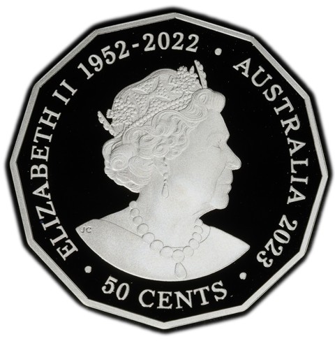 6th crowned portrait of HM Queen Elizabeth II facing right (the Commonwealth effigy), wearing the George IV State Diadem, the Coronation Necklace and Earrings framed by inscriptions “ELIZABETH II,” “AUSTRALIA, 2023” the denomination “50 CENTS.”