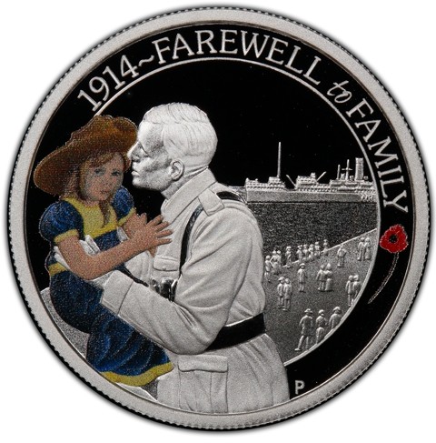 The coin’s reverse features an Australian soldier saying goodbye to his crying daughter on the wharf while he waits to board the boat to take him away to war. The inscription ‘1914 – FAREWELL to FAMILY’, a red poppy motif, and The Perth Mint’s traditional ‘P’ mintmark.