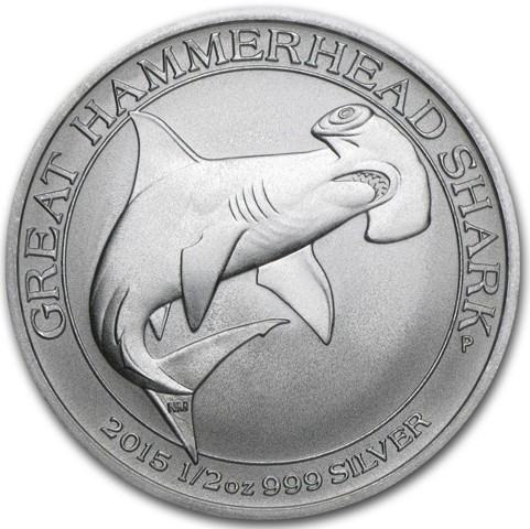 The reverse design features a Great Hammerhead Shark swimming in the ocean. Around above, the inscription GREAT HAMMERHEAD SHARK. surrounded by its name above, weight, purity. The P mint mark of the Perth Mint is on the right. The designer's initials (NM) are on the shark's tail