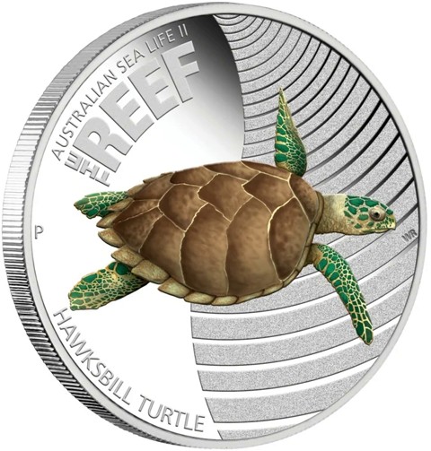 The reverse of coin depicts the swimming Hawksbill Turtle in full color, at the upper left in two lines the legend identifying the theme 'AUSTRALIAN SEA LIFE - THE REEF' and a fish name below left "HAWKSBILL TURTLE' . The Perth Mint's mark, "P," is included on the left hand side and the designer's initials "WR" in tiny letters at the opposite.