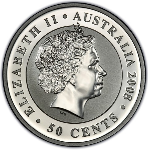 Fourth crowned portrait of HM Queen Elizabeth II facing right, wearing the Girls of Great Britain and Ireland tiara. framed by inscriptions “ELIZABETH II,” “AUSTRALIA,” the denomination “50 CENTS,” the year 2008.