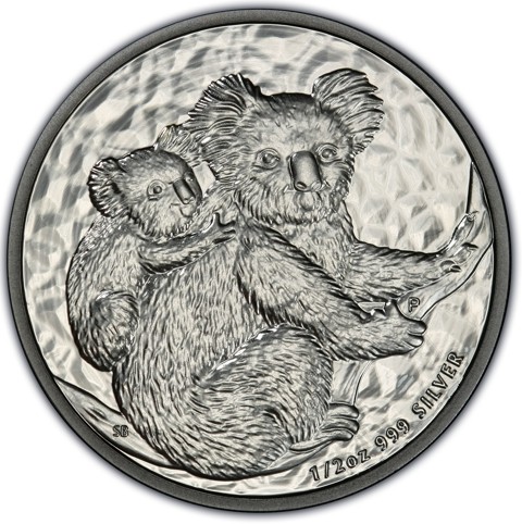 a baby koala atop its mother's back. The mother clings to a gum tree branch. The Perth Mint's traditional "P" mint mark, the weight and purity are included in the design.