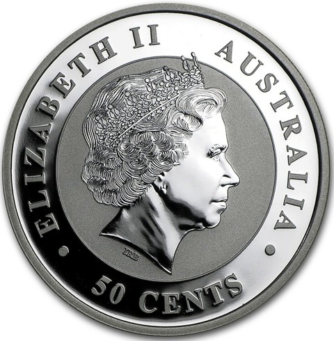 Fourth crowned portrait of HM Queen Elizabeth II facing right, wearing the Girls of Great Britain and Ireland tiara. framed by inscriptions ELIZABETH II, AUSTRALIA, 50 CENTS. Denomination is placed below.
