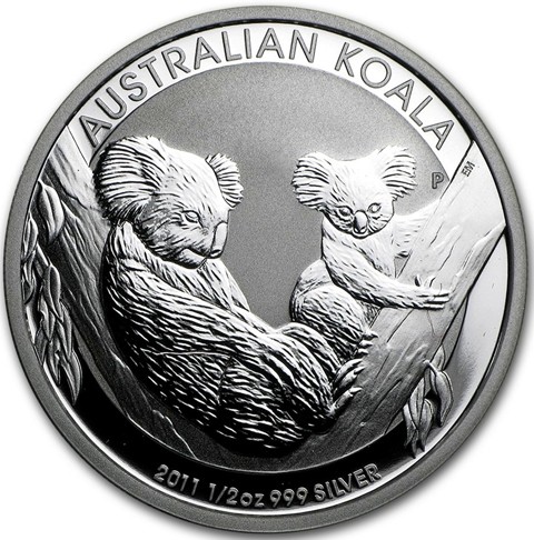 The reverse depicts an adult koala and a young koala in the fork of a tree. The furry marsupial is native to Australia and has quickly become iconic of the country. Inscriptions encircle the outer edge of each coin. "Australian Koala" is at the top while "2011", the weight, and "999 Silver" are toward the bottom. and the Perth Mint's mark, "P," is included at the right side next to the designer's initials "EM" in tiny letters.