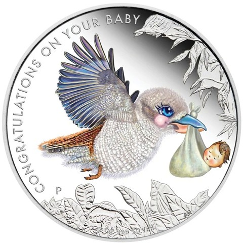 The reverse features a beautifully colored kookaburra in flight, with wings spread wide and feathers highlighted in delicate shades of blue and violet. In its beak, the bird carries a cloth bundle holding a newborn baby’s head peeking out, symbolizing the arrival of new life. Around the design, finely engraved foliage frames the scene, while the inscription CONGRATULATIONS ON YOUR BABY arcs above.