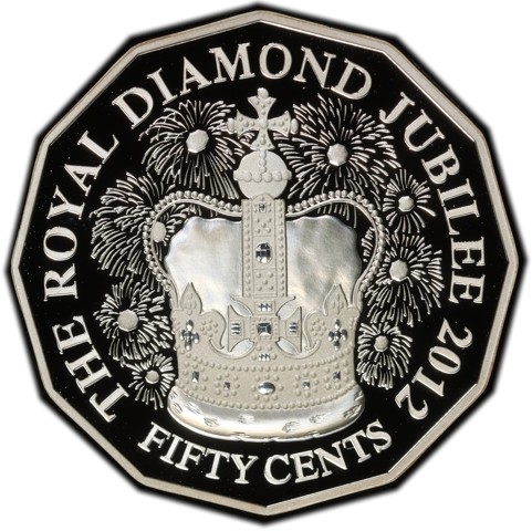 The reverse design features St Edwards Crown worn by her majesty during her coronation ceremony, in the background added also diamonds and fireworks fitting for such a milestone surrounded by inscription identify the theme a date of issue "THE ROYAL DIAMOND JUBILEE 2012". Denomination in letters at the bottom.