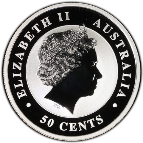 Fourth crowned portrait of HM Queen Elizabeth II facing right, wearing the Girls of Great Britain and Ireland tiara. framed by inscriptions ELIZABETH II, AUSTRALIA, 50 CENTS. Denomination is placed below.