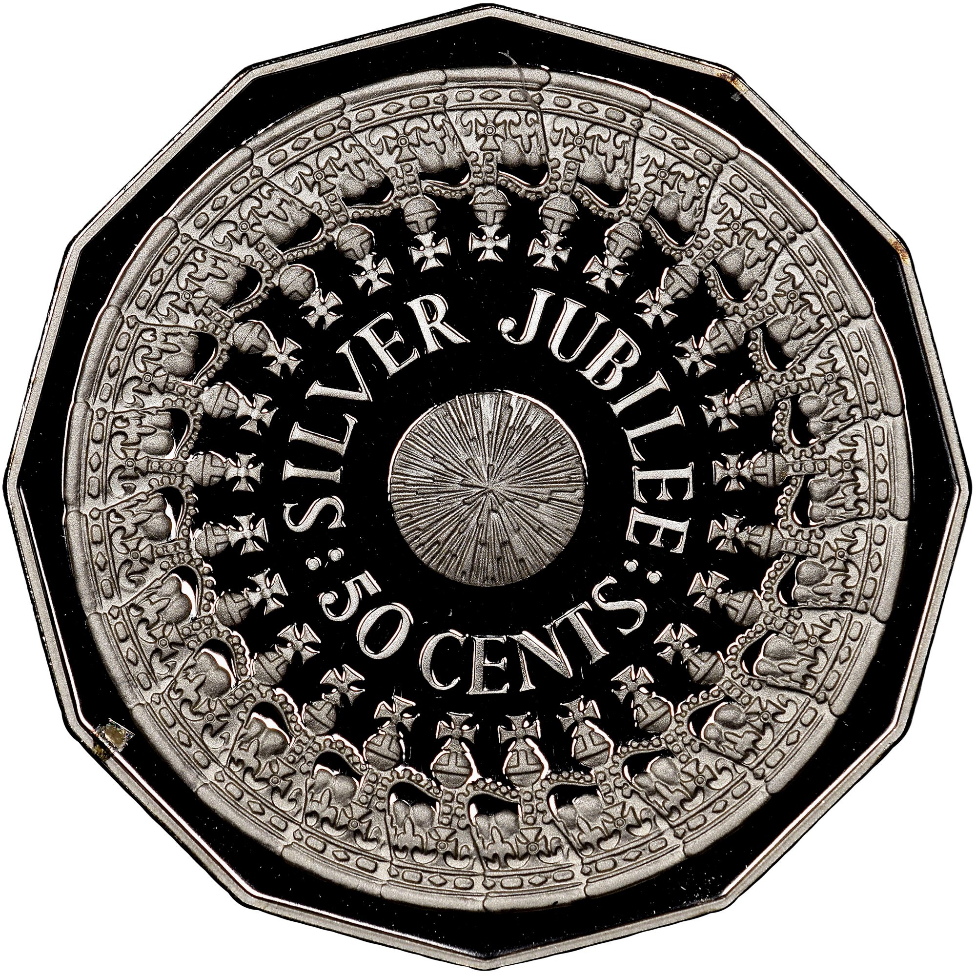 The reverse depicts a wattle blossom at center within a ring of 25 overlapping crowns between which the legend identifying the theme "SILVER JUBILEE" and face value 50 CENTS.