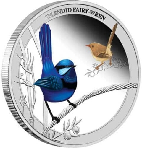 On the reverse of the coin is a colorful mating male wren with another wren off in the distance and female is predominantly grey-brown in color in the background. Inscriptions around the scene read "SPLENDID FIARY-WREN." Also present is the Perth Mint’s mint mark of ‘P’.