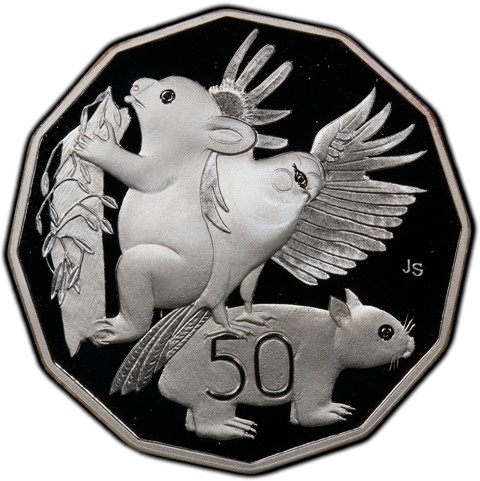 The reverse design incorporates three Australian fauna icons - a koala holding onto a gum tree a lorikeet with wings outstretched and a wombat. The (12 year old John Serrano) designer's initials JS. The denomination 50 is on the body of the wombat.