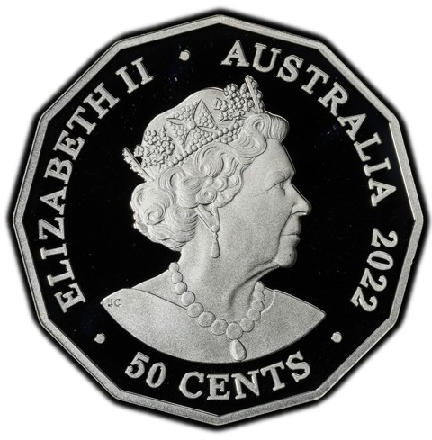 6th crowned portrait of HM Queen Elizabeth II facing right (the Commonwealth effigy), wearing the George IV State Diadem, the Coronation Necklace and Earrings framed by inscriptions “ELIZABETH II,” “AUSTRALIA, 2022” the denomination “50 CENTS.”