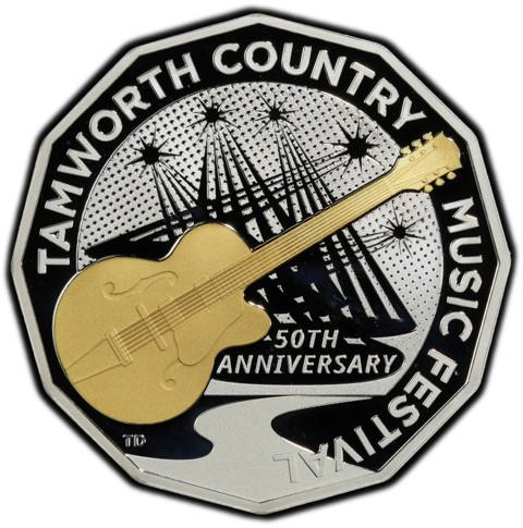 The reverse of the coin depicts a gilt with 24 carat gold electric guitar at center. In the background, rays of stage lights, below which the inscription identify theme "50TH ANNIVERSARY" and "TAMWORTH COUNTRY MUSIC FESTIVAL" around the rim. The designer's initials (TD) are below left.