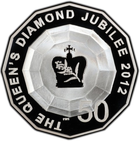 The reverse design depicts a raised diamond with a St Edwards Crown at the center and a sprig of wattle surrounded by the legends read "The Queen's Diamond Jubilee 2012". This coin depicts Designer's initials bELOW the diamond, a stylized (MM) and denomination at the right below.