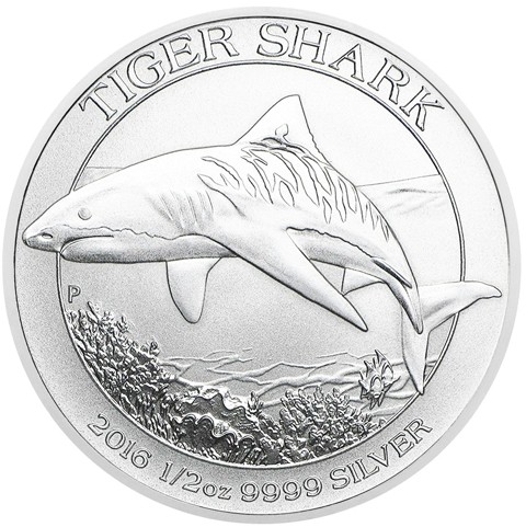 The reverse depicts a detailed image of a swimming tiger shark, surrounded by the inscription TIGER SHARK above, the date of issue and the precious metal content: 2016 1/2oz 9999 SILVER below. The Perth Mint's P mint mark is on the left, below the shark's head. The designer's initials, (TV) are on the corals below right, opposite the V in SILVER.