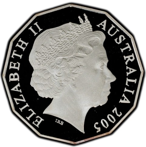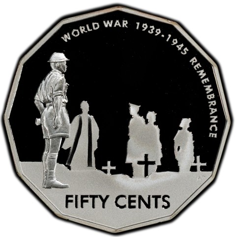 The reverse depicts a burial at El Alamein in 1942, a cemetery with a soldier, a priest and mourners standing solemnly against a background of graves, surround by the inscription identifying the theme "WORLD WAR 1939 - 1945 REMEMBRANCE." The value value "FIFTY CENTS" are in the exergue. The designer's initials (WP) at the right below field below the cross.