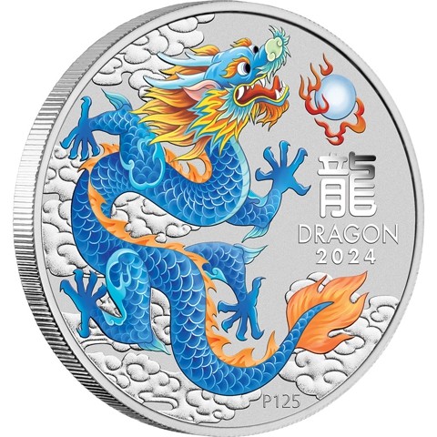 On the reverse of colorized coin, a majestic blue dragon takes center stage, a symbol of wisdom. This mythical creature is depicted in flight, pursuing a flaming pearl across the coin’s surface. The design also incorporates inscriptions celebrating the Perth Mint’s 125th anniversary and the traditional Chinese character representing the dragon. Inscriptions include DRAGON, 2024, and P125.