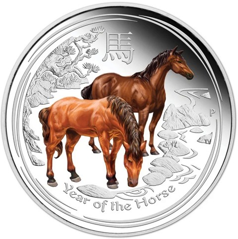 The reverse features two horses rendered with lifelike detail and enhanced by rich colorization: one stands proudly, while the other grazes by a flowing stream. Above them is the Chinese character for Horse, and at the bottom the inscription “Year of the Horse.” The surrounding background includes natural elements such as trees, rocks, and water, giving the design a complete and harmonious look.