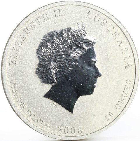 Fourth crowned portrait of HM Queen Elizabeth II facing right, wearing the Girls of Great Britain and Ireland tiara. framed by inscriptions “ELIZABETH II,” “AUSTRALIA,” the denomination “50 CENTS,” the year 2008, and silver purity and weight.