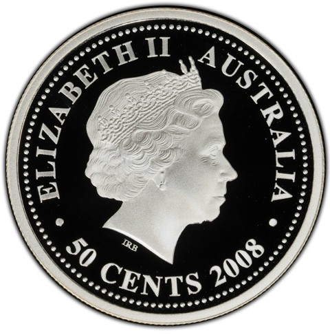 Fourth crowned portrait of HM Queen Elizabeth II facing right, wearing the Girls of Great Britain and Ireland tiara. framed by inscriptions ELIZABETH II, AUSTRALIA, 50 CENTS, 2008. Denomination and the coin's date of mintage inscribed below.