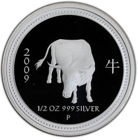 The reverse features a large Ox. The image is framed by ornamental patterns, with inscriptions 2008, the Chinese character (牛) for Ox , and 1/2 oz 999 Silver, confirming the weight and purity and the Perth Mint's mark, "P," is included.