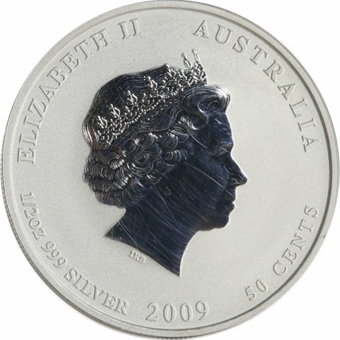 Fourth crowned portrait of HM Queen Elizabeth II facing right, wearing the Girls of Great Britain and Ireland tiara. framed by inscriptions “ELIZABETH II,” “AUSTRALIA,” the denomination “50 CENTS,” the year 2008, and silver purity and weight.