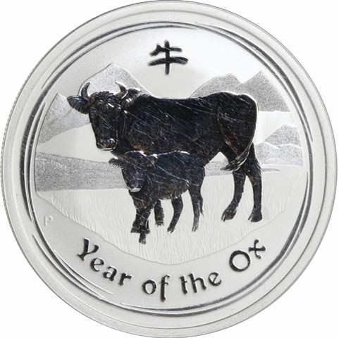 The reverse depicts a mother ox with her calf standing in a rice field, framed by distant mountains and a flowing river. Above them appears the Chinese character (牛) for “Ox,” while at the base is the inscription “Year of the Ox.” This touching family scene highlights the values of diligence, loyalty, and harmony, which are central to the zodiac sign. In Chinese culture, those born under the Ox are known for their perseverance and reliability and the Perth Mint “P” mintmark is included at the left side.