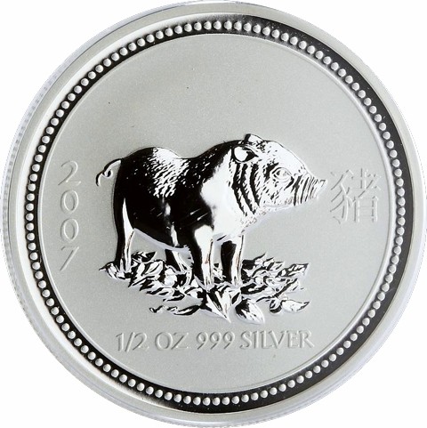 The reverse displays a finely detailed pig standing on grassy ground, its sturdy body and alert expression symbolizing prosperity, honesty, and determination. To the left appears the year 2007, while the right side carries the Chinese character for "Pig" (豬). Below is the inscription 1/2 OZ 999 SILVER, framed by a beaded rim and the Perth Mint's mark, "P," is not included.