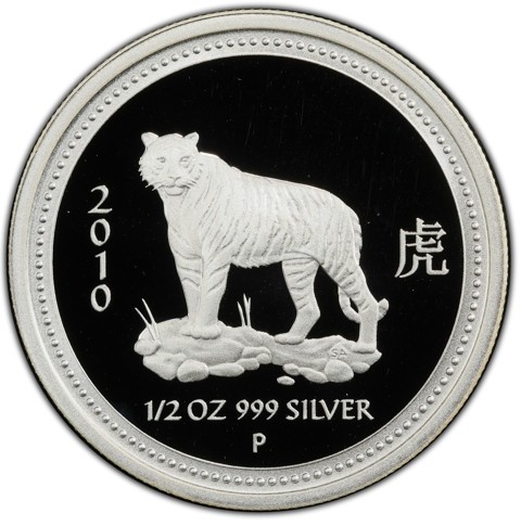 The reverse depicts a finely detailed tiger standing on rugged rocks, its muscular body and expressive stripes rendered with lifelike precision. Inscriptions include “2010,” the Chinese character (虎) for Tiger, and “1/2 oz 999 Silver,” with a beaded border completing the design and the Perth Mint's mark, "P," is included below.