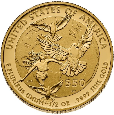 Features Wonder Woman™ with three doves soaring high above Earth. This design reflects Wonder Woman’s role as a global ambassador in pursuit of peace and her steadfast commitment to justice, peace, and equality. Inscriptions are “UNITED STATES OF AMERICA,” “E PLURIBUS UNUM,” “$50,” “1/2 OZ,” and “.9999 FINE GOLD.”