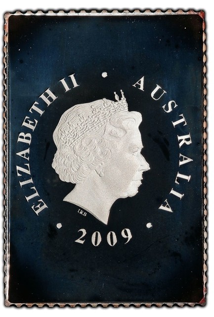 In a stamp-shaped coin, fourth crowned portrait of HM Queen Elizabeth II facing right, wearing the Girls of Great Britain and Ireland tiara, surrounded by the inscriptions of "ELIZABETH II," "AUSTRALIA," "2009."