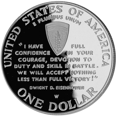 The obverse design of the coin features an American soldier advancing on the beach at Normandy and other servicemen in the trenches.