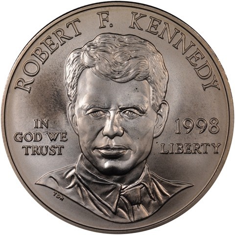 The obverse of the 1998 Robert F. Kennedy Commemorative Silver Dollar bears an especially realistic engraving of Robert F. Kennedy. The sculptor/engraver worked with Kennedy's widow, Ethel, to perfect the depiction of her late husband.