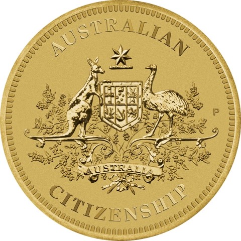 The reverse of the coin portrays the Commonwealth Coat of Arms, accompanied by the words AUSTRALIAN and CITIZENSHIP, and year-date. The Coat of Arms consists of the badges of six States of the Commonwealth on a shield enclosed by an ermine border signifying Australian Federation in 1901. The crest of the Arms, including a seven-pointed star, appears above the shield is supported by a kangaroo and an emu standing on a grassy mound accompanied by small branches of golden wattle. A seven-point gold Commonwealth Star sits above the shield. Six of the star’s points represent the Australian states and the seventh point represents the territories. The P mint mark of the Perth Mint is to the right. In the background, floral decoration and a ribbon below the shield inscribed AUSTRALIA.