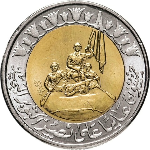 Soldiers in an inflatable boat holding the Egypt flag in the center and the inscription of event in Arabic "50th Anniversary of the glorious October Victory" and 50 in western numerals above.