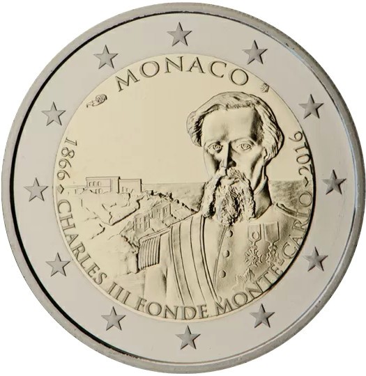 CHARLES III within the background MONTE CARLO. At the top is the name of the issuing country flanked by the mint mark and the mint master mark. At the bottom, in semi-circle from left to right is the inscription ‘1866 CHARLES III FONDE MONTE CARLO 2016’. The coin’s outer ring bears the 12 stars of the European Union.