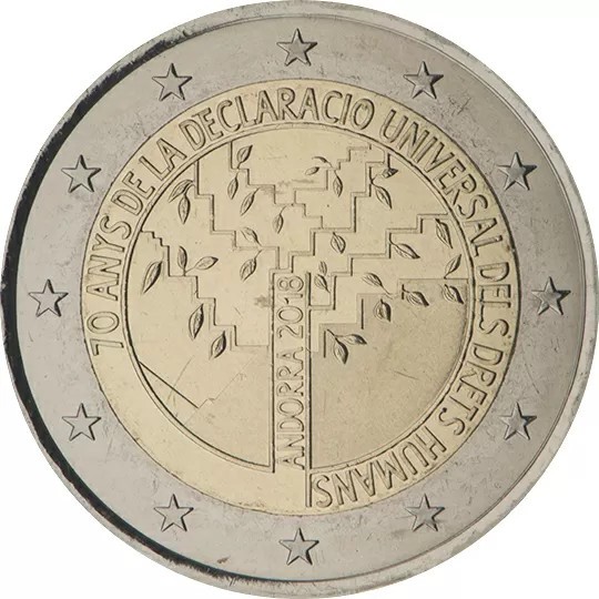 Seven staircases (representing the seven parishes or administrative divisions of Andorra) in the shape of mountains that lead to the valley, where there is the name of the issuing country ‘ANDORRA’ and the year of issue. These staircases are, at the same time, the branches of a tree symbolizing humankind, of which Andorra is an integral part. 30 leaves come out of the branches of this tree representing the 30 articles of the Universal Declaration of Human Rights. The Catalan inscription ‘70 ANYS DE LA DECLARACIÓ UNIVERSAL DELS DRETS HUMANS’ (70 years of the Universal Declaration of Human Rights) surrounds the design, strengthening this commemorative event. The coin’s outer ring bears the 12 stars of the European Union.