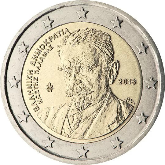 Portrait of the Greek poet Kostis Palamas (1859-1943). Inscribed along the inner edge at left is the wording ‘HELLENIC REPUBLIC’ and the name ‘KOSTIS PALAMAS’ (in Greek). Also inscribed is a palmette (the mintmark of the Greek Mint) and the year of issue. Visible at the lower right is the monogram of the artist (George Stamatopoulos). The coin’s outer ring bears the 12 stars of the European Union.