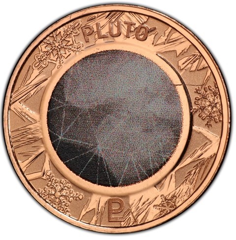 The reverses of the coins feature color-printed depictions of the planet Pluto in pad printed Grey and a decorative border representing Ice Crystals and Jagged Shards of Ice representing the extreme coldness of Pluto with Symbol of Pluto below.