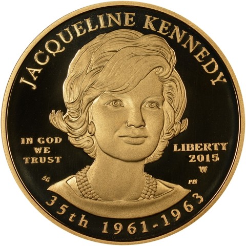 The obverse design of the coin features a portrait of Jacqueline Kennedy. The obverse inscriptions read “JACQUELINE KENNEDY”, “IN GOD WE TRUST, “LIBERTY”, “2015 W”, “35TH” and “1961-1963”. The latter two inscriptions refer to the order of the Presidency and the years served in office.