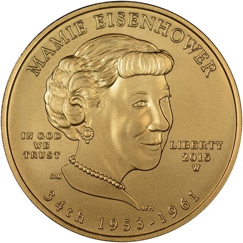 The obverse of the Mamie Eisenhower Coin features a three-quarter right facing portrait of the First Lady. The inscriptions include “MAMIE EISENHOWER”, the motto “IN GOD WE TRUST”, “LIBERTY”, the date and mint mark “2015 W”, the order of the Presidency “34TH”, and the dates served “1953-1961”.