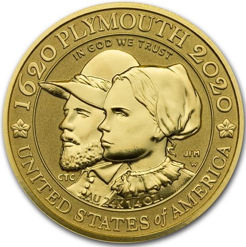 The reverse depicts portraits of a Pilgrim man and woman, representing the beginnings of a transition from monarchy to democracy. The dual portraits symbolize a democratic organization, with their resolute expressions focused on a self-determined future. A pair of mayflower blossoms flank the design.