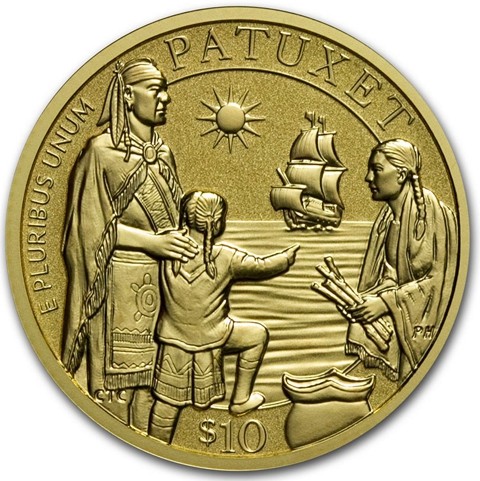 The obverse design depicts a Wampanoag family watching from the border of the design as the Mayflower arrives from foreign shores. A young boy steps on the border, representing the intersection of the Wampanoag people in their Patuxet homeland and the Mayflower passengers.