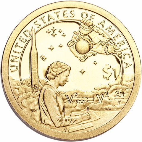 The reverse design featuring Mary Golda Ross writing calculations. Behind her, an Atlas-Agena rocket launches into space, with an equation inscribed in its cloud. An astronaut, symbolic of Native American astronauts, including John Herrington, spacewalks above. In the field behind, a group of stars indicates outer space. Inscriptions are “UNITED STATES OF AMERICA” and "$1."
