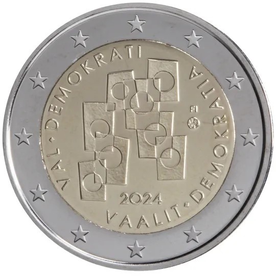 Stylized ballot papers. Ballots consist of circles and rectangles. The subject is abstract, but still recognizable. There are eight ballots, and they are partially overlapped, creating smaller geometric shapes at the intersections of the overlapping tickets. The year of issue is at the bottom. The lettering ‘FI’ is on the right-hand side slightly above the midline. The text VAALIT ♦ DEMOKRATIA rotates on the right-hand side of the money ring. The text VAL ♦ DEMOKRATI is circling the coin on the left-hand side. The coin’s outer ring bears the 12 stars of the European flag.